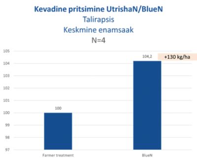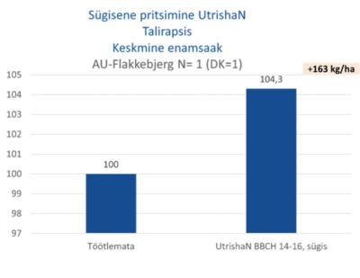 Muude katsete tulemused, kus võrreldi talvise rapsi sügisest ja kevadist pritsimist, näitavad UtrishaN kasutamise paindlikkust – seda võib kasutada nii sügisel kui ka kevadel ning toote tõhusus sellest ei muutu. Sügisel on lihtsalt pritsimisaeg laiem, samas kui kevadised öökülmad võivad pritsimisaega piirata. Seega pakub UtrishaN jätkusuutlikku alternatiivset lämmastikuallikat, mis vähendab sõltuvust mullast lämmastiku omastamist ja tagab lämmastiku kättesaadavuse taimele kogu taime kasvu vältel. Ja mis kõige tähtsam – seotud lämmastik ei puutu kokku leostumise ega aurustumise ohuga.